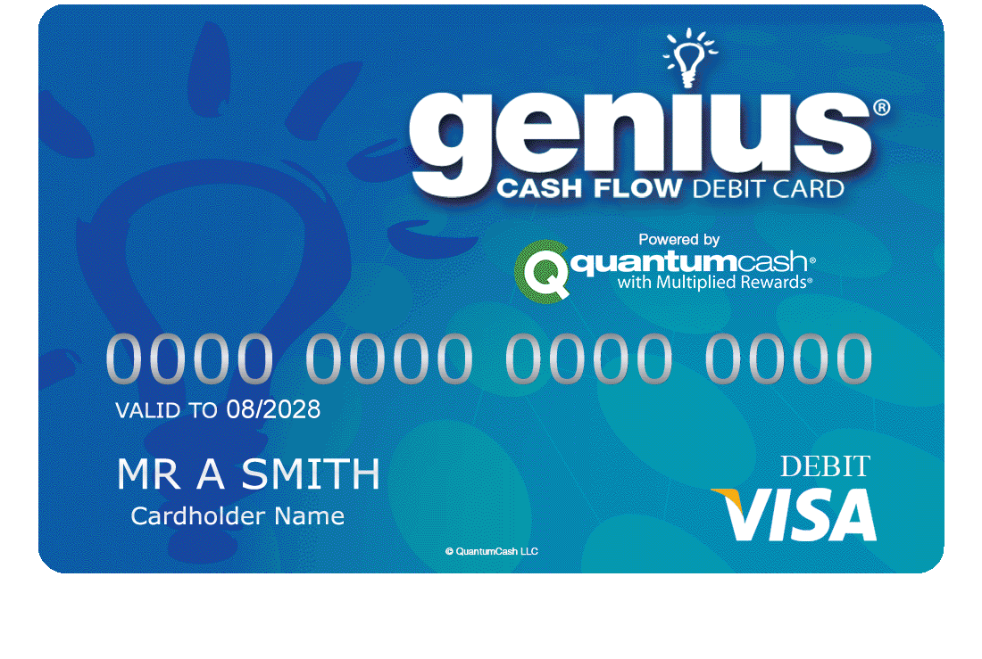 - The GeniusCard is a debit card that is powered by QuantumCash, an innovator in consumer rewards. Unlike traditional debit cards that drain money out of your bank account, the GeniusCard can actually put cash INTO your account.